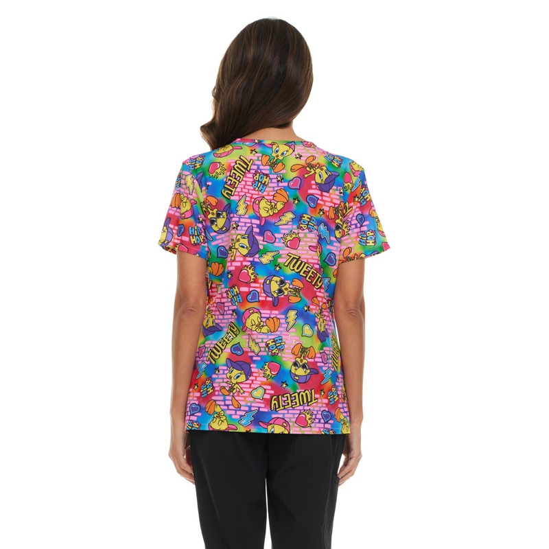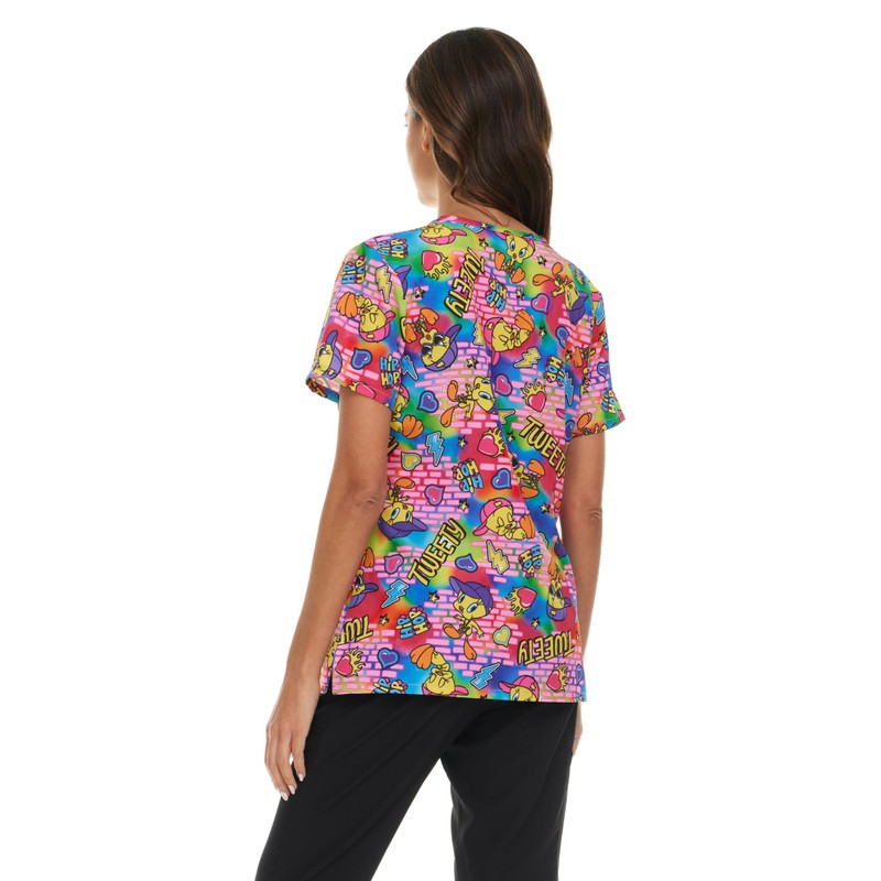 Looney Tunes Women's All Over Print, V-Neck Scrub Top with Pockets - Comfortable Work Uniform, Pink Bricks HipHop Graffiti Tweety, X-Large