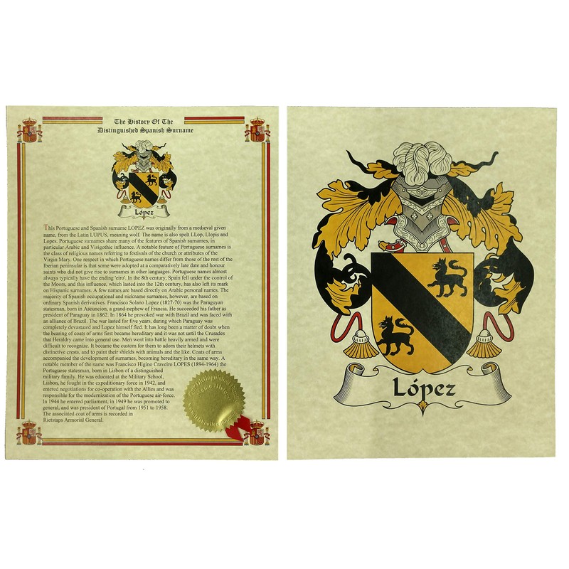 Lopez - Coat of Arms and Last Name History - 8.5x11 Print Combo Set