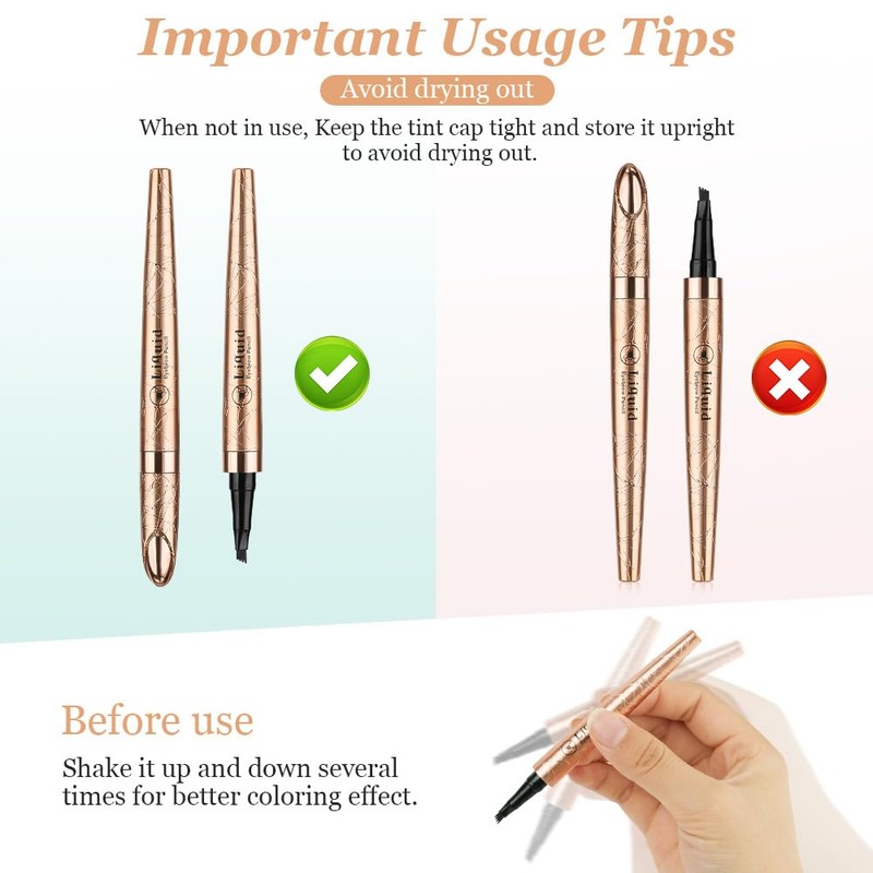 - 【Easy To Use】Please shake the eyebrow pencil up and down several times before use to mix the liquid in the pen; if there is too much liquid in the pen tip, please absorb it with paper. When used, only the normal eyebrow drawing steps can be used to create a natural and wild eyebrow shape.