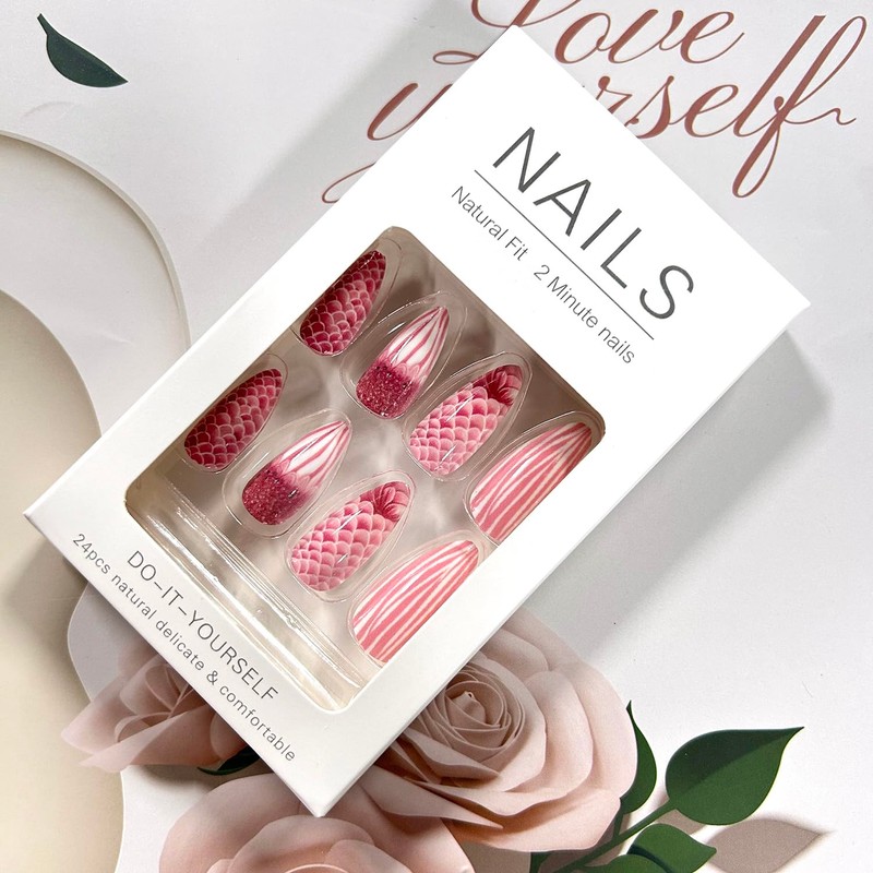 - Artificial Nails Package : You'll get 24 pieces false nails have 12 different sizes of nails, 1 mini nail file, 1 small wooden stick, 1 piece of nail glue sticker, and the free nail file can be trimmed to any size you like