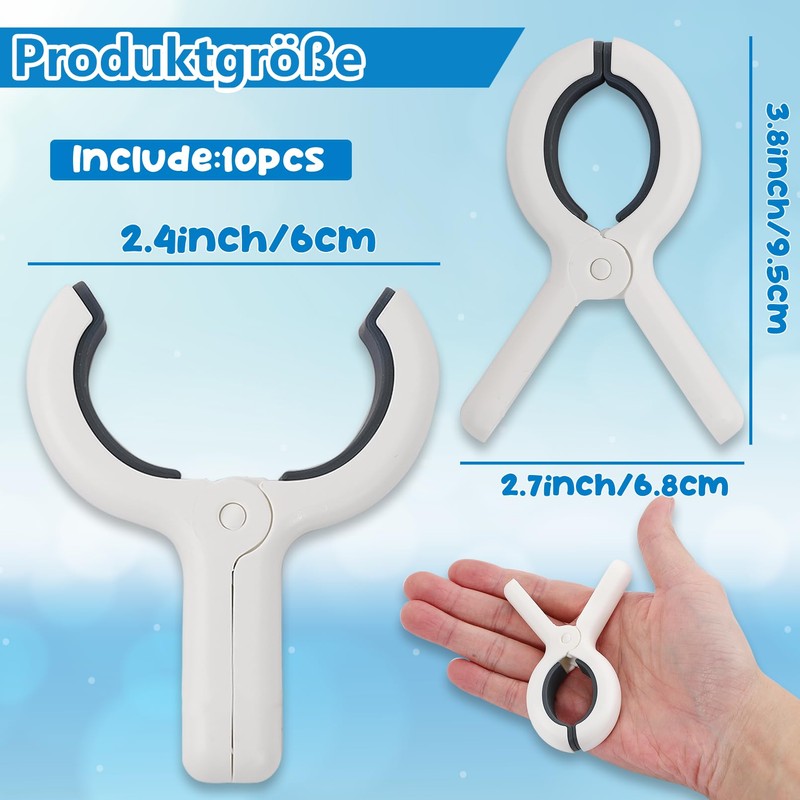 - Package includes: 10 beach towel clips, each clothespin measures 9.6 x 6.8 cm, the towel clips have a maximum opening of 6 cm width. Attach your towel to the beach chair, make sure the towel is not blown away, very suitable for daily use at home or when travelling.