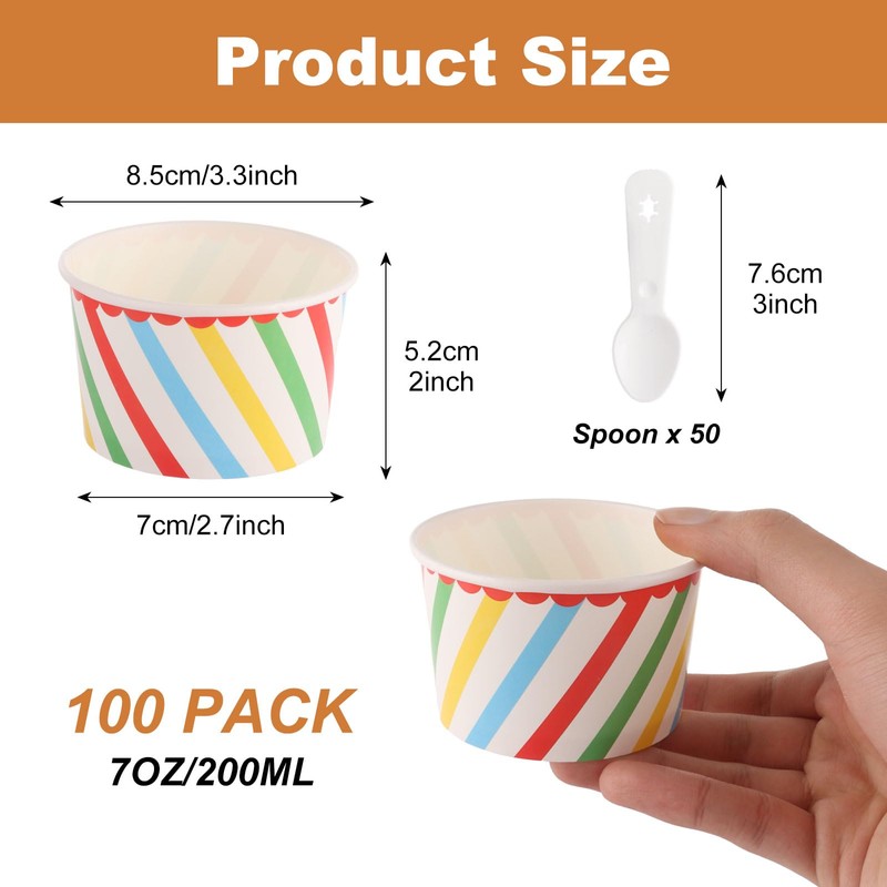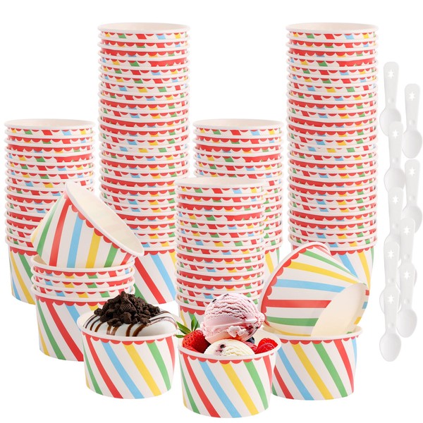 LOPYXBR 100PCS Ice Cream Cups 7oz/200ml Paper Ice Cream Bowls with Spoon Ice Cream Tubs Disposable Dessert Ice Cream Cups for Soup, Yogurt, Snack (Colorful Stripes)