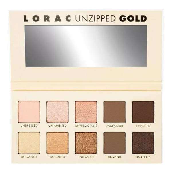 Da rienda suelta a tu belleza natural con la paleta de sombras de ojos mate y brillante Unzipped GOLD de LORAC, 10 sombras de ojos ultra ricas, brillantes y mate.