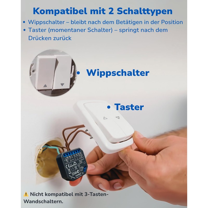 - Four modules for smart control throughout the home: Turn your existing 230 V roller shutters into smart devices cost-effectively - without replacing the motor or wall button. The compact 47 × 48 × 16 mm module is discreetly installed in Ø60 mm flush-mounted boxes (depth ≥ 55 mm) and is fully compatible with existing 2-button rocker or button switches. Only compatible with 4-wire tubular motors with neutral conductor (N), max. 300 W