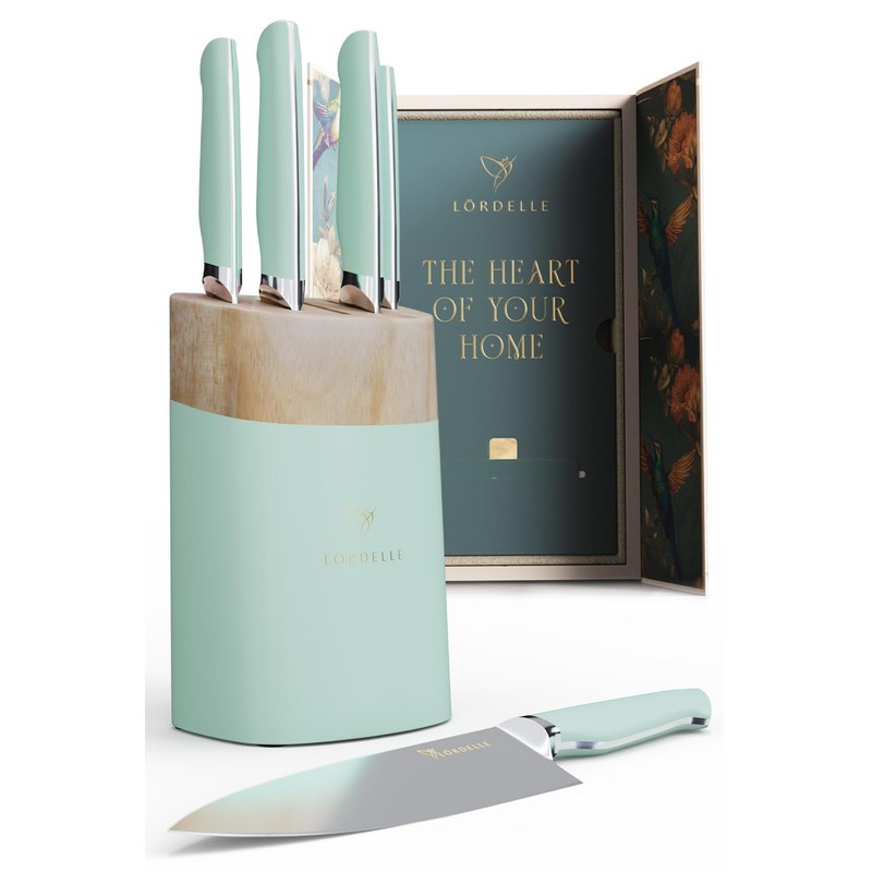 Lordelle Knife Block Set - 5 Piece Set - Coastal Green - Lifestyle Home Kitchen Design - German X50 Stainless Steel - ABS Handle - Ash Wood Block - Cooking Chef Knife, Santoku, Paring, Utility