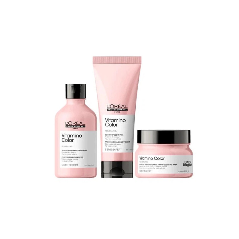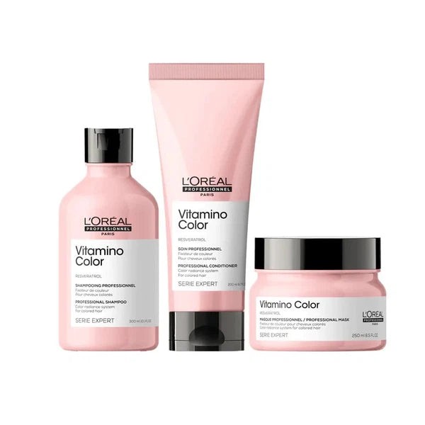 The L'Oréal Professionnel Vitamino Bundle is a haircare set that protects your hair colour and boosts the intensity and shine levels with the Vitamino Color range by L’Oréal Professionnel.