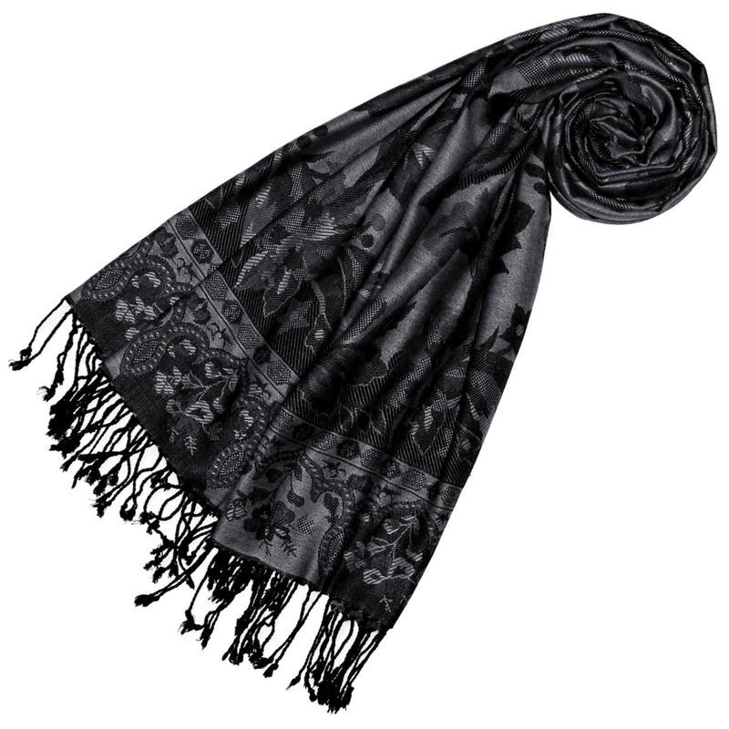 Lorenzo Cana Brands Pashmina 78330 Women's Scarf Shawl Stole Wrap Natural Fibre Opulent Pattern in Harmonious Colours with Fringes Black Grey 70 cm x 200 cm, black