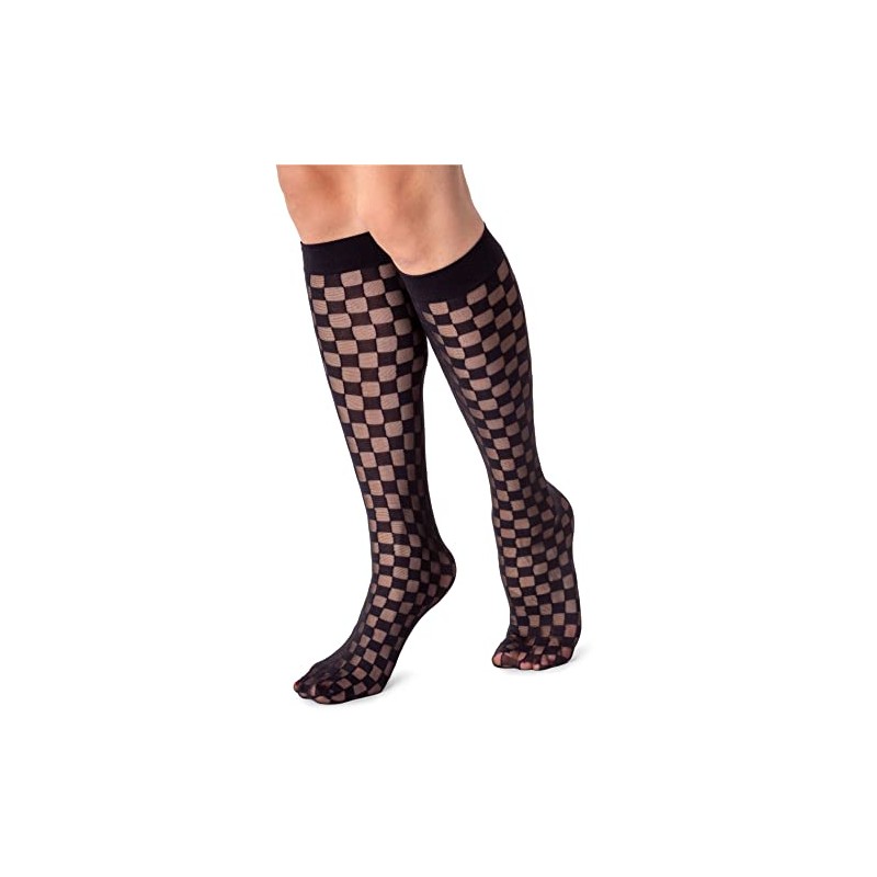 LORES Ladies Sheer Knee High Socks Fancy Pattern Soft Top Funny Long Socks, Scacchi Nero
