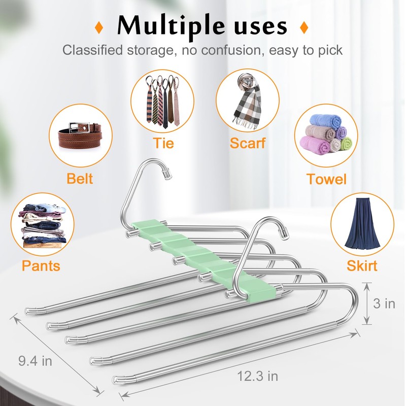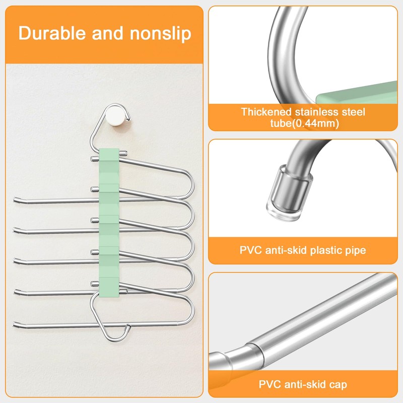 • Anti-slip design: There are five stainless steel elbow tubes on the pant hanger, with an anti skid cap at both ends, and a black PVC plastic pipe in the middle of each tube, which can effectively prevent the pants from slipping.