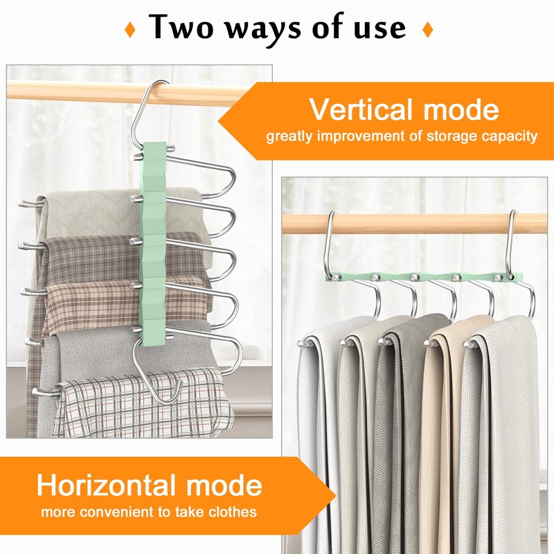 • Two modes: It can be hung horizontally or vertically according to different need. The horizontal suspension makes the pants easier to take out of the wardrobe. The vertical hanging can make full use of closet space while maintaining order.