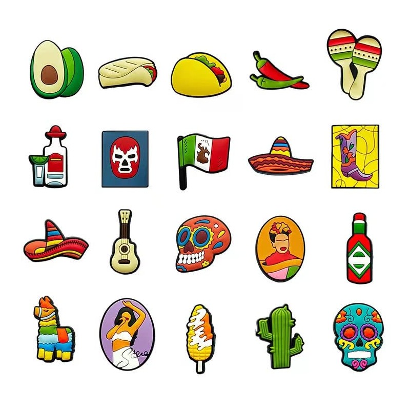 - 20 piezas: 20 dijes de zapatos con temática mexicana sin duplicar como se muestra en la imagen, cantidad perfecta para decorar tus zapatos sandalias con una forma fresca y atractiva.