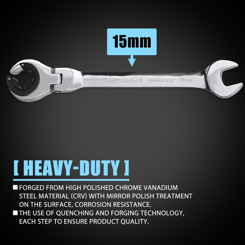 LOSCHEN 1PC 15mm Open Flex-Head Ratcheting Wrench, Metric Ratcheting Spanner with 76 Teeth, Chrome Vanadium Steel Tubing Ratchet Spanner