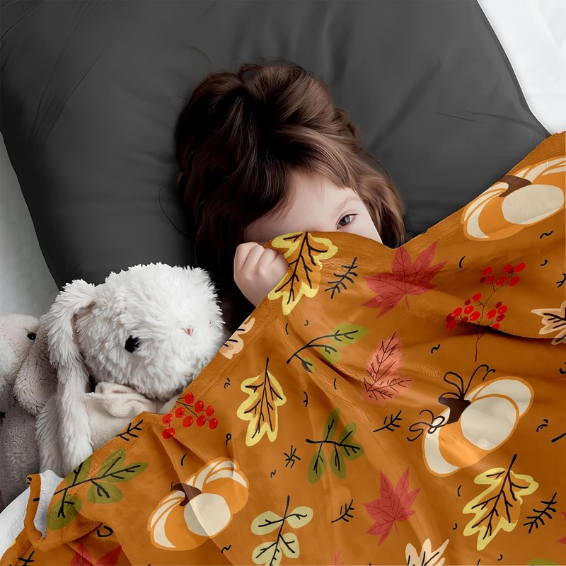 LOSIVISHE Autumn Harvest Flannel Throw Blanket – Fall Pumpkin and Leaf Pattern – Soft and Cozy Blanket for Sofa or Bed, W60 x L80in