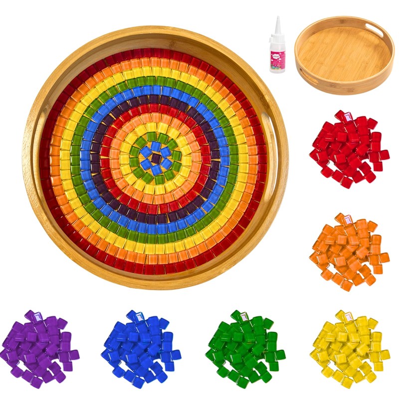 - ALL-IN-ONE KIT: Everything you need is in the box! The kit includes a 10-inch (25cm) wooden tray base, 6 colors of glass mosaic tiles, a detailed instruction guide, and strong adhesive. Your creative arts and crafts project awaits!