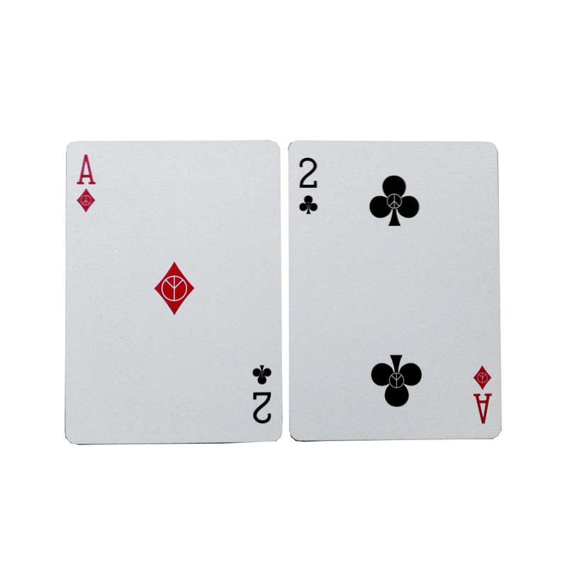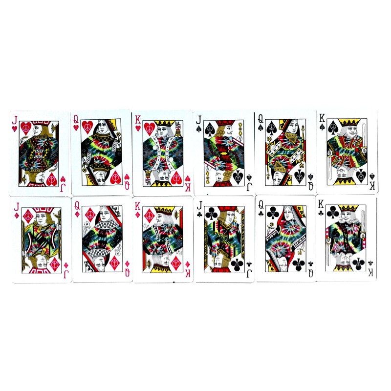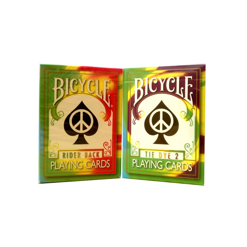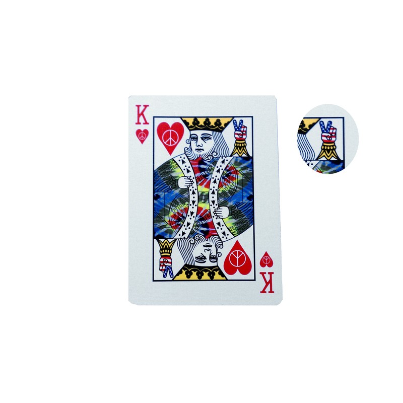 Tie Dye 1: Cards Feature a Tie Dye Designed Back that can be used in any standard 52 card game and even includes 2 Gaff cards to do a magic card trick called Million Dollar Monte. The jokers are a Dove and a Patriotic colored Piece Sign, there is also a a piece sign on the center of the Ace of Spades and check out the pictures, look real close at the suicide King of Hearts which normally has him holding a knife thru his head, but this deck has something different instead of the knife, Check it out, very cool. Cards measure standard poker size 2.5" x 3.5" regular index and are made with High Quality Bicycle Playing Card Stock Tie Dye 2: Cards Feature a Tie Dye Designed Back that can be used in any standard 52 card game and even includes 2 Gaff cards to do a magic card trick called Million Dollar Monte. The jokers are a Love & a Peace colored button pin. There is also a a peace sign on each of the pips of every card, the court cards clothing show they have interesting style, and look real close at the suicide King of Hearts which normally has him holding a knife thru his head, but this deck has something different instead of the knife. Check it out, very cool. Cards measure standard poker size 2.5" x 3.5" regular index and are made with High Quality Bicycle Playing Card Stock.