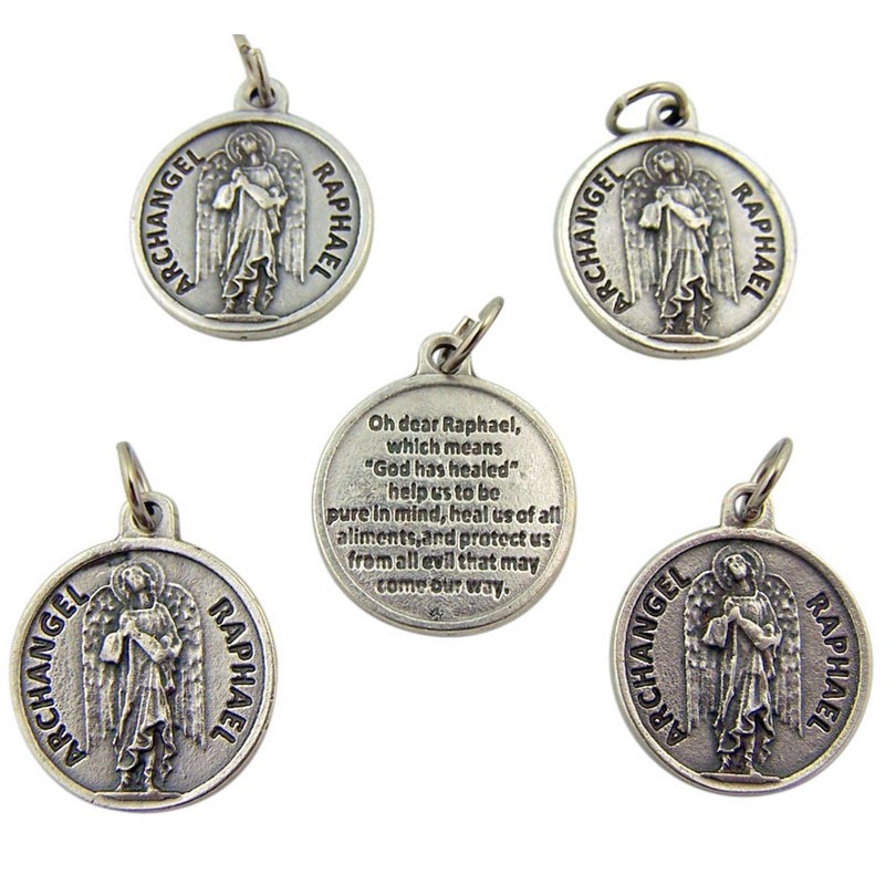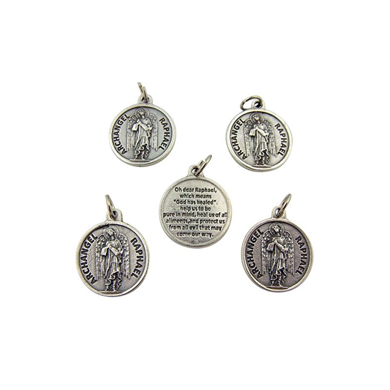 Lot of 5 Archangel Saint Raphael 7/8-inch Silver Tone Medal with Prayer on Back by Lumen Mundi