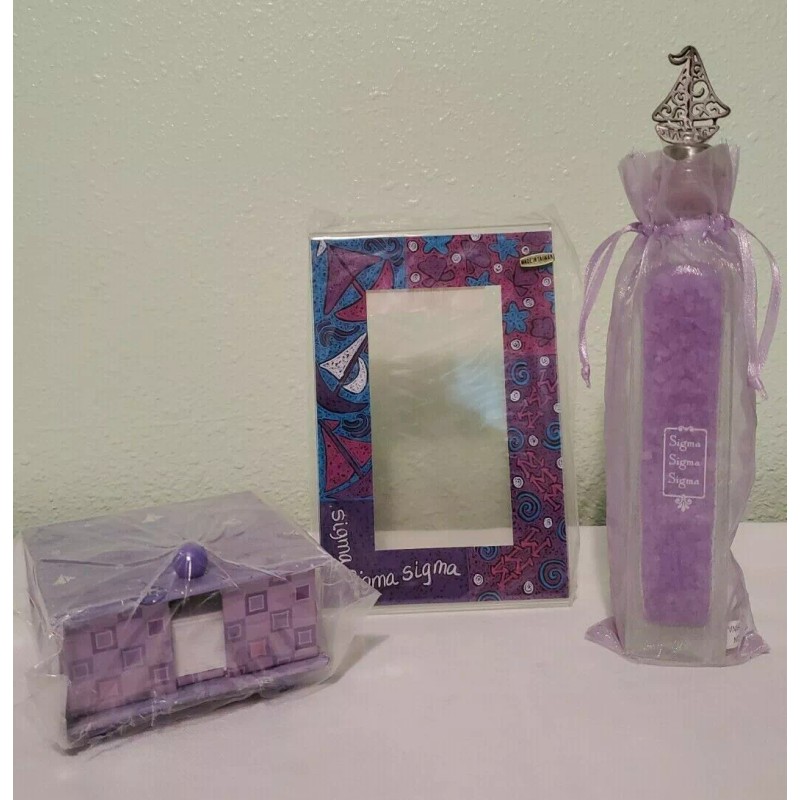 This listing is for a Sigma Sigma Sigma Sorority memo box (with paper), picture frame and bath crystals (in a glass jar with a sailboat topper. These items are new.