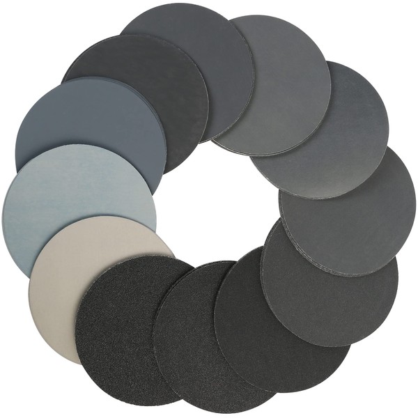 - VALUE PACK: 60pc 6” sanding discs - 60 80 120 240 400 600 800 1000 2000 3000 5000 7000 Grit variety pack, 5 each of 12 different grits, meets all your coarse to extra fine sanding and polishing needs