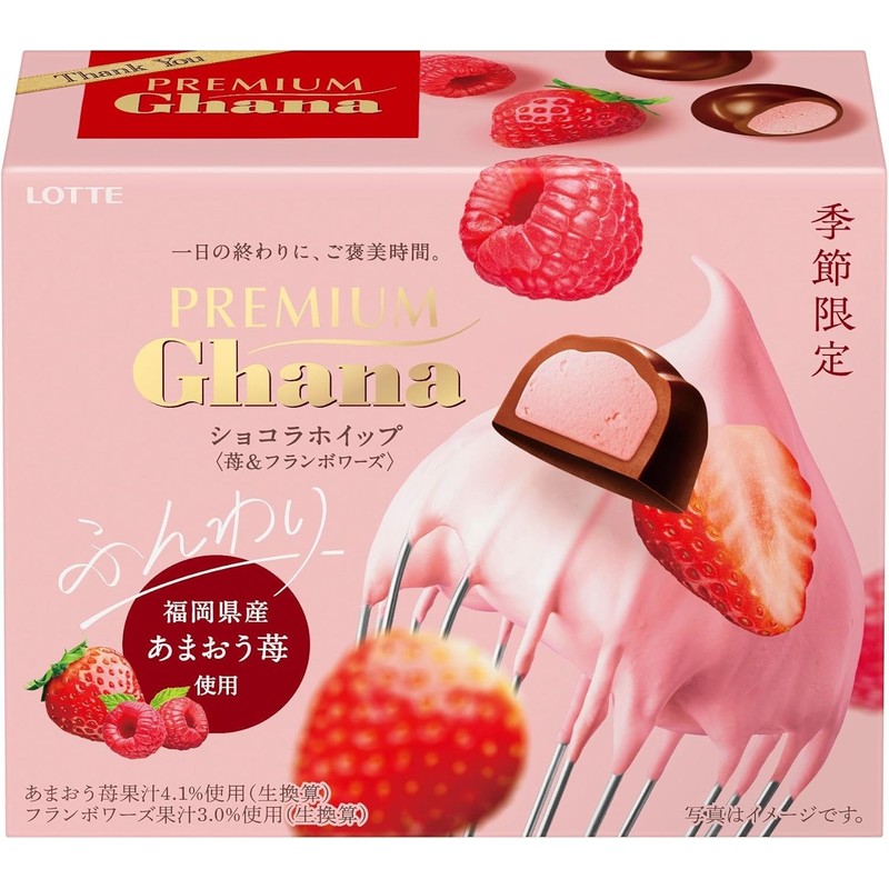 - Soft and light chocolate wrapped in Ghana milk, this is the perfect spring and summer treat. The airy whipped chocolate has a light and fluffy texture, and the gorgeous sweet and sour taste of Ama-ou strawberries and raspberries from Fukuoka Prefecture spreads in your mouth. Enjoy a luxurious snack time with the new Premium Ghana as a reward for your hard work today.