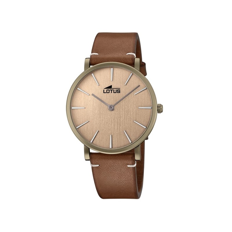 - The Lotus men's watch has an analogue drive, a brown dial and a brown leather strap