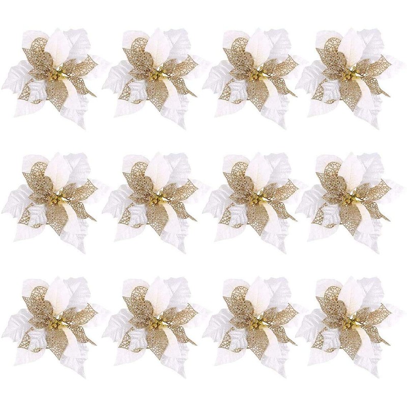 Louiesya Pack of 12 Glitter Artificial Wedding Christmas Flowers Glitter Poinsettia Christmas Tree Ornaments Dia 9 Inch (White)