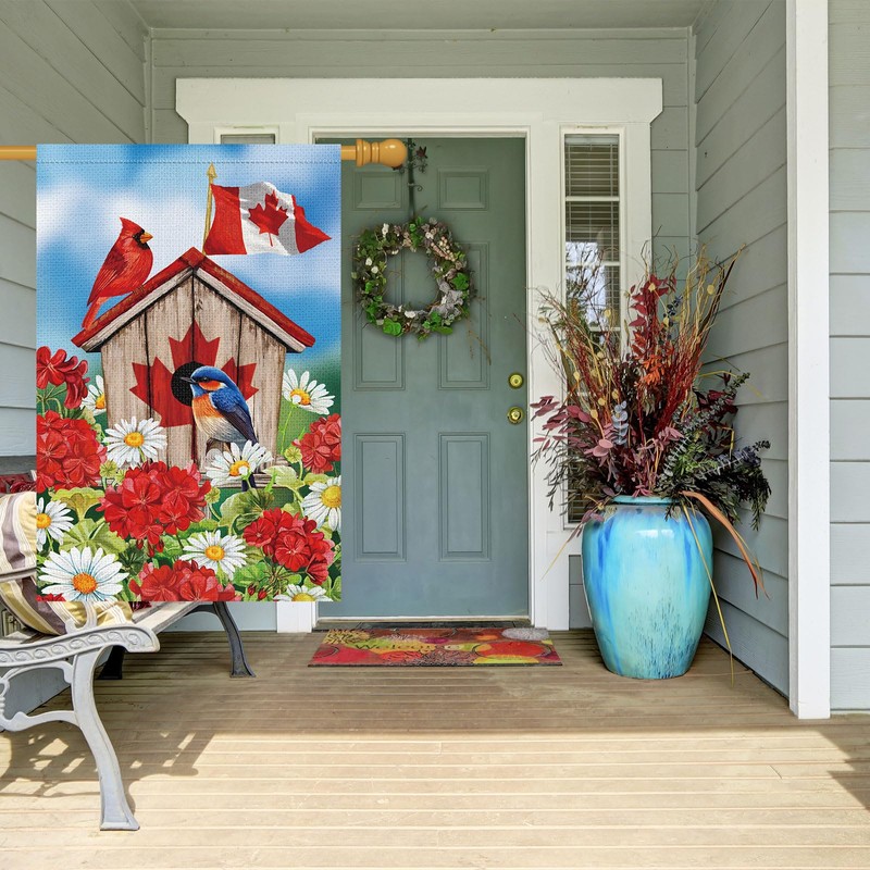 - For Canada Day Home Garden Decorations: This patriotic themed garden flag is decorated with patriotic bird house and floral pattern. Add some seasonal atmosphere to your home decor, add a colorful, bountiful touch of the season to your home and garden.