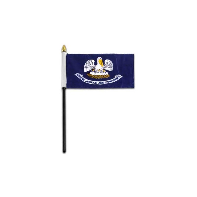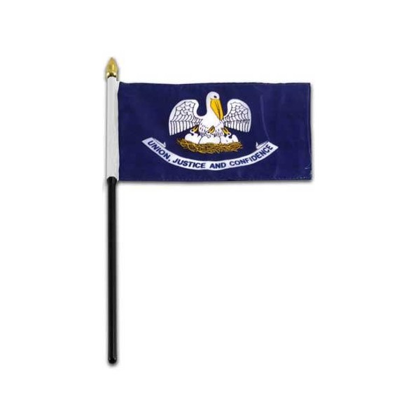Louisiana state stick flag 4 inch x 6 inch, mounted on a 10 inch plastic stick. Flag is made from polyester and printed in bright colors to make an attractive flag. Each flag is individually sewn around the edges.