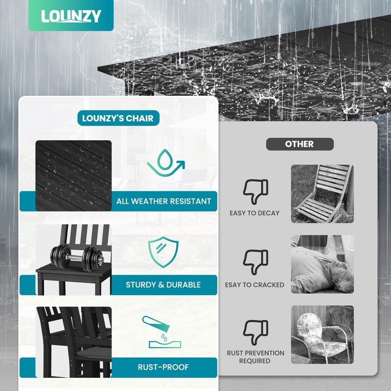 - LOW MAINTENANCE FOR INDOOR&OUTDOOR USE - Crafted from high-quality HDPE Material, LOUNZY patio dining sets offer a blend of strength and aesthetic appeal. Features a wood-textured design, giving it a classic look that works well both indoors and outdoors. Durable and easy to clean, simply wipe the surface with a damp cloth for effortless upkeep and lasting beauty