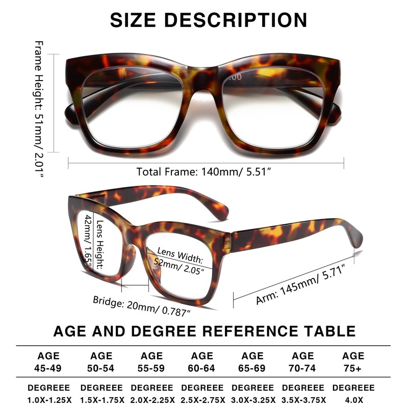 - 【STURDY SPRING HINGE】The flexible spring hinge range of 145° enables quick adjustment of the glasses to fit different face shapes. It does not feel uncomfortably squeezed, providing you with a comfort fit.