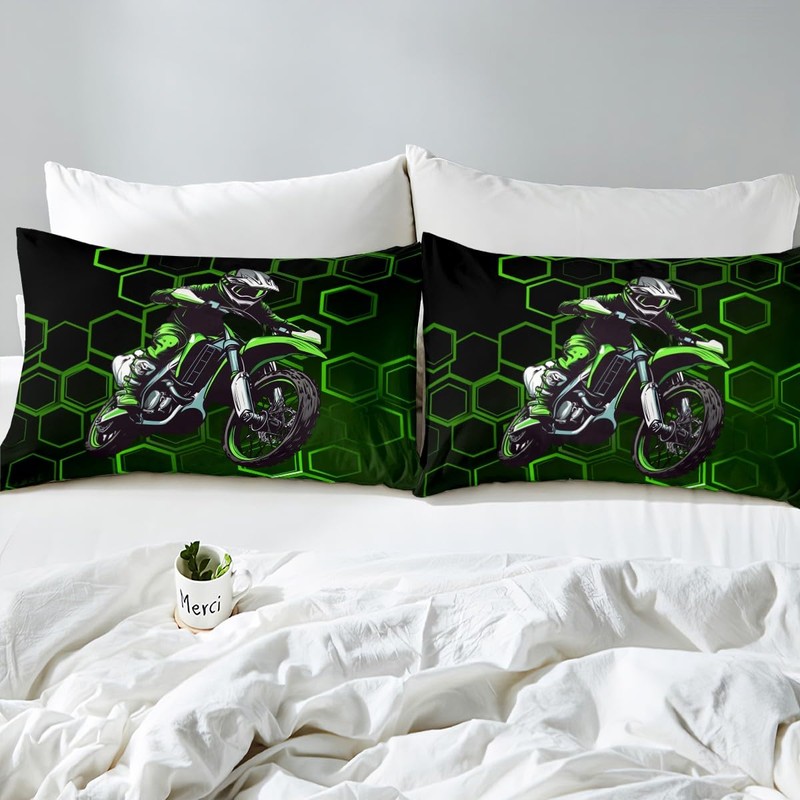 Loussiesd Green Honeycomb Dirt Bike Duvet Cover Set Double Size For Kids Boys Teens Men Extreme Sports Bedding Set Hexagonal Geometric Comforter Cover with 2 Pillowcases Motorbike Beds Set