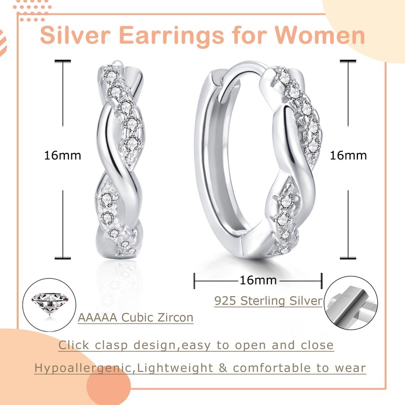 - Hoop earrings material: silver women's hoop earrings are made of the finest 925 sterling silver with AAAAA cubic zirconia. High polish keeps silver women's hoop earrings shiny forever. 925 silver hoop earrings are hypoallergenic and nickel-free, suitable for almost all sensitive ears. The closure of the women's hoop earrings is stable and safe. So you don't have to worry about losing the hoop earrings silver women's earrings.