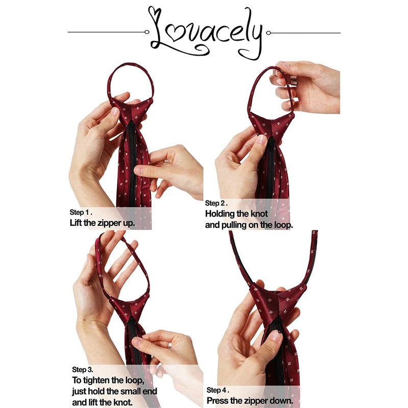 Levanta la cremallera hacia arriba, sujeta el nudo y tira del bucle, para apretar el bucle, simplemente mantén el extremo pequeño y levanta el nudo, presiona la cremallera hacia abajo. Estas corbatas son perfectas para aquellos que no quieren pasar tiempo anudando.