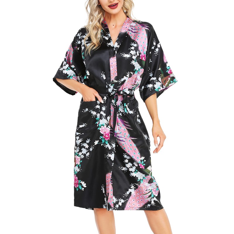 - đăWOMEN PEACOCK FLORAL ROBESăKimono Peacock is lightweight women's robe that offers heady luxury at an affordable price.Kimono robes could meet almost your needs. From valentine gift for woman, bridesmaid robe, hen party, wedding morning, bridal shower, spa day, birthday gift for her, or even as a cosplay geisha costume. Silk robe is also ideal for beach, poolside, sunbathing and water parks.