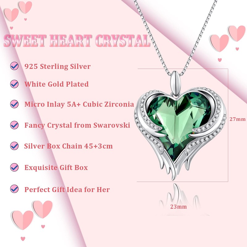 Love Heart Necklaces, Love Heart Angel Wings Pendant Necklace for Women Silver Crystal Necklace Women Silver Tone Crystal Birthstone Necklace CZ Diamond Necklace Green Crystal Pendant Necklace Mother