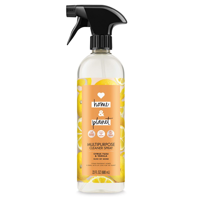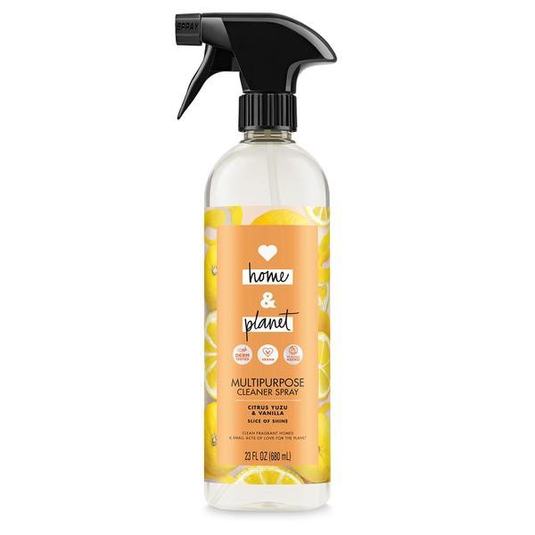 Our all purpose cleaners are loaded with powerful plant-based cleansers, to make your home shine with cleanliness, plus they are vegan and cruelty free. This multipurpose cleaner spray is loaded with powerful plant based cleansers to make your home shine with cleanliness. Counters, mirrors, coffee tables, sinks - rejoice! Infused with the notes of ethically sourced Vanilla absolute and blended with sparkling Japanese Yuzu, this spray will leave your surfaces spotless with a refreshing kiss of nature. Dermatologist tested and pH neutral. We've started our journey towards more eco-friendly cleaning products by loading our products with ingredients that come from renewable sources and packing them in recycled and recyclable bottles Our goal is a carbon footprint so small, it's like we weren't even here. So every time you choose Love Home and Planet, you join our mission for a cleaner planet: We support environmental change-makers. Our voluntary carbon tax supports recycling initiatives. HOW TO USE: For general cleaning, spray entire surface, scrub as needed. For tough stains, spray and allow to sit for 1 minute, then scrub as needed. No need to rinse, just wipe clean. Safe for use on: Ceramic, Chrome, Concrete, Corian, Formica, Granite (sealed and unsealed), Laminate flooring, Marble (unsealed), Porcelain, Stainless steel, Travertine. Safe for use with CAUTION (Test first on an inconspicuous spot): Acrylic, Fiberglass, Glass, Marble (sealed), Mirror, Plate glass, Porcelain coated steel, Satin, Nickel, Vinyl sheet flooring, Wood (oil-based coating). NOT safe for use on: Aluminum, Brass, Wood (finished and unfinished). KEEP OUT OF REACH OF CHILDREN.