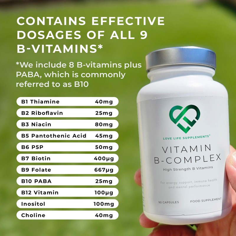 LOVE LIFE SUPPLEMENTS Vitamin B Complex High Strength | 90 Capsules - 90 Day Supply | All 9 B Vitamins B1-B2-B3-B5-B6-B7-B9-B10-B12, Inositol and Choline | Completely Clean - No Fillers | Love Life Supplements