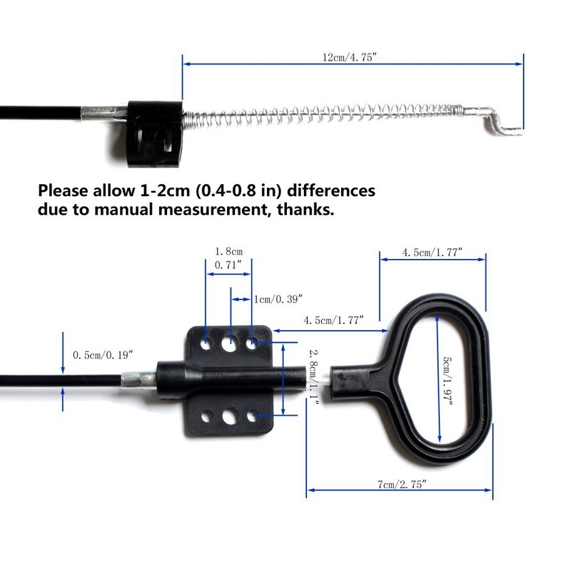 Recliner replacement cable This style recliner cable fits for most major furniture brands recliners, this recliner handle includes the recliner mechanism cable and recliner mechanism clip, and you will get comfortable grip when kick back and release with D-pull style recliner release handle design. Plastic sheath and S tip The d ring recliner cable is reinforced with a black plastic sheath at the base of the handle, also this cable features a D-Ring pull and a fastening plate with six screw holes at one end, the other end features an insertable clip for holding the S tip. Specifications: Recliner cable material: steel S tip material: metal D-ring handle material: plastic Recliner cable color: black D-ring release handle size: 1.77 x 1.97 inch Exposed cable length (from plastic plug to end of S tip): 4.75 inch Total cable length: 38.9 inch Features: This cable features a D-Ring pull release handle. One end is a fastening plate with six screw holes. The other end features an insertable clip for holding the S tip. Replacement recliner cable for sofa recliner and fits for most recliner brands. Package includes: 2 x Replacement recliner cable