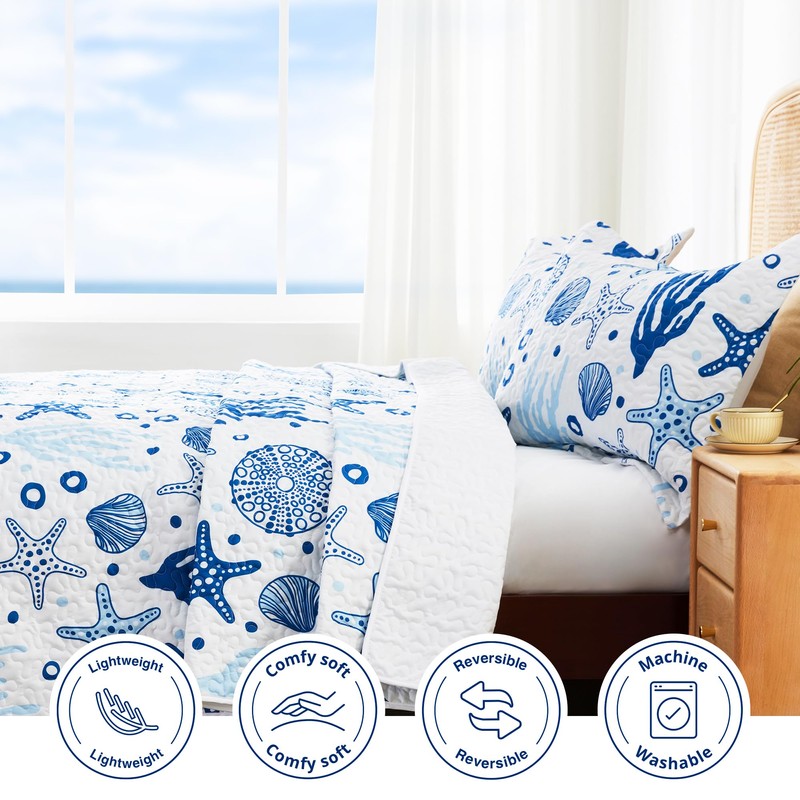 - Outstanding Feature: Our lightweight quilt set is printed with a delicate coastal ocean pattern which is a beautiful choice for homeowners whose house has beach-themed decoration. Tight stitching or seams on the edging will hold up through washing and won't unravel for longer years to use - Lightweight, durable bedspread sets are perfect for family with pets or kids.