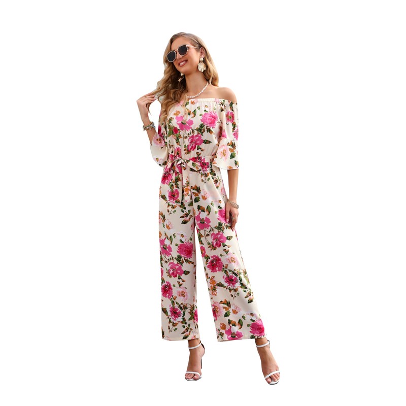 Love Welove Fashion Jumpsuits for Women, Floral Off Shoulder Ruffled Short Sleeve High Waist Wide Leg Pants Romper
