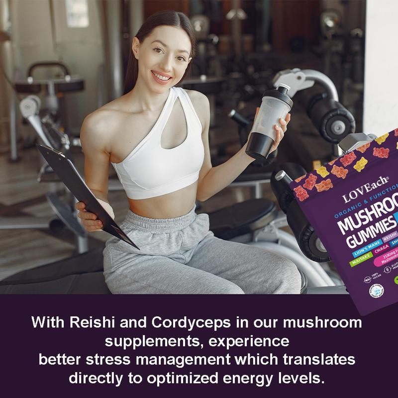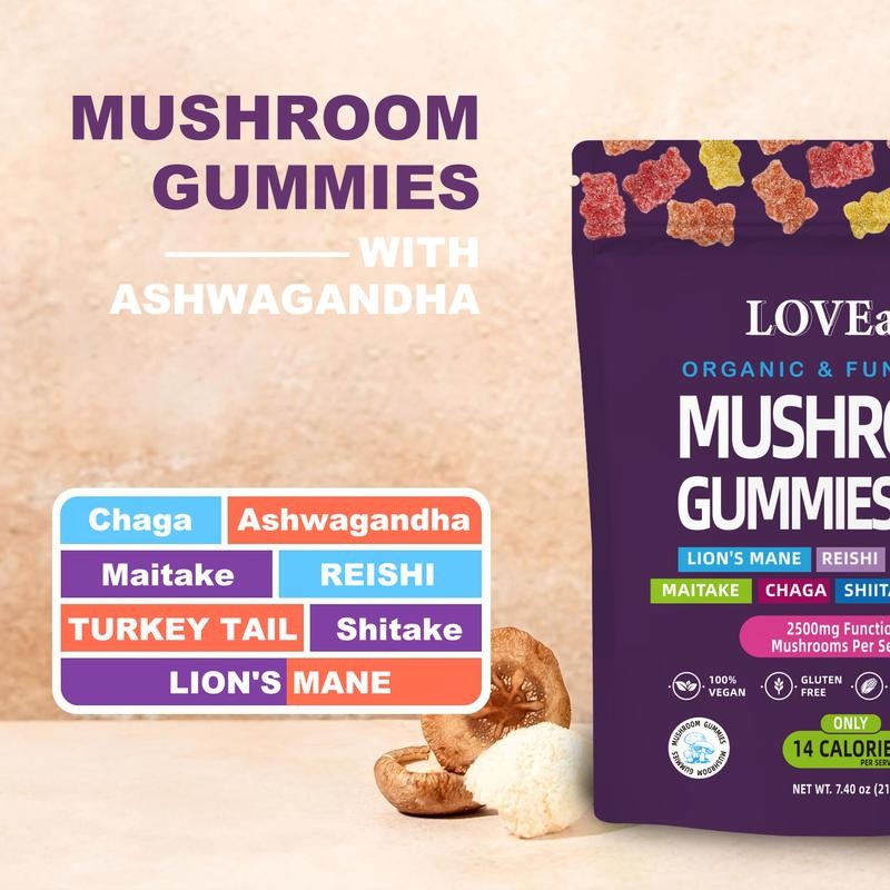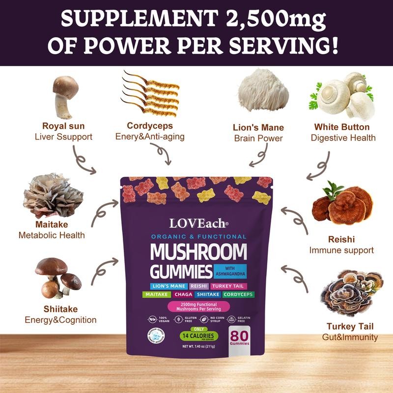 Boost your daily health routine with LOVEach Mushroom Gummies, crafted with a potent blend of functional mushrooms and Ashwagandha (KSM-66). Each serving delivers 2500mg of Lion’s Mane, Shiitake, Turkey Tail, Reishi, Maitake, Chaga, and Cordyceps to support metabolism, immunity, focus, and overall wellness.
