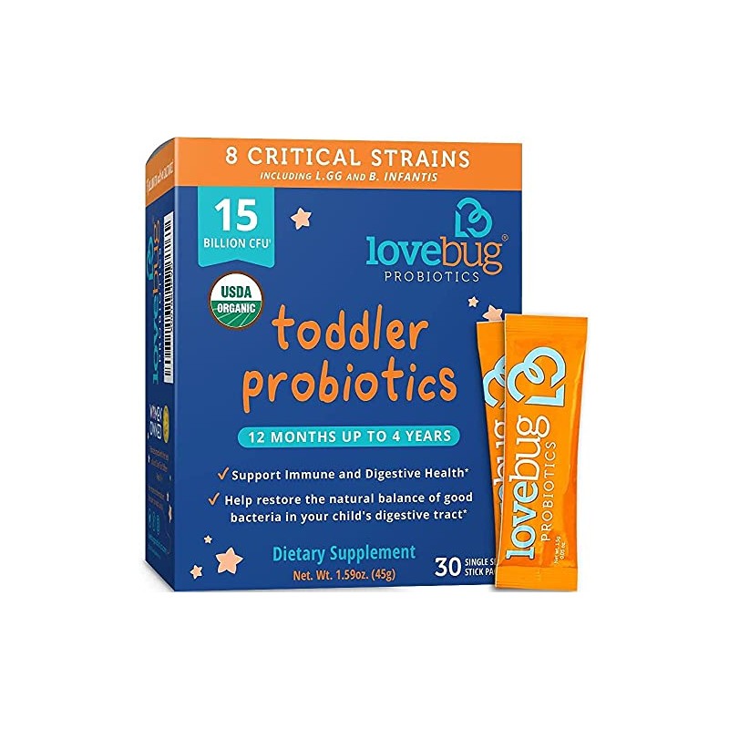 - PRODUCT CONTAINS: 1 box, 30 packets LoveBug Tiny Tummies infant probiotics for babies from 12 months - up to 4 years of age. Flavorless, non-GMO & gluten free. With 15 billion active cultures & multi-strain support, including Lactobacillus GG. Supports baby's digestive + immune health.