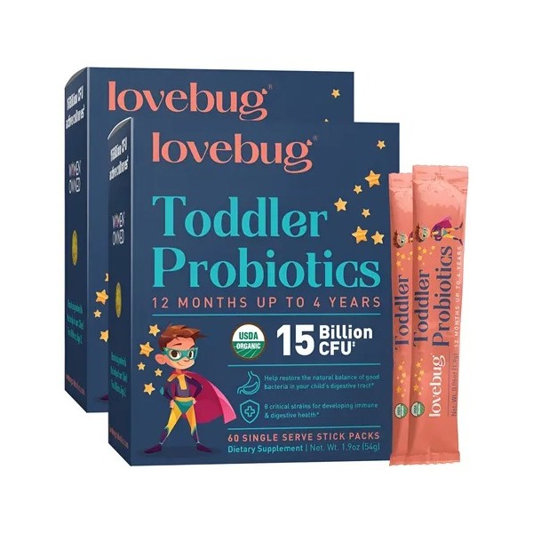 - MALESTAR DIGESTIVO, DIARREA Y ESTREÑIMIENTO: Niños pequeños tienen microbioma delicado que requiere cepas específicas para restaurar balance. LoveBug Toddler & Kids usa 8 cepas probióticas clínicamente testadas para niños.