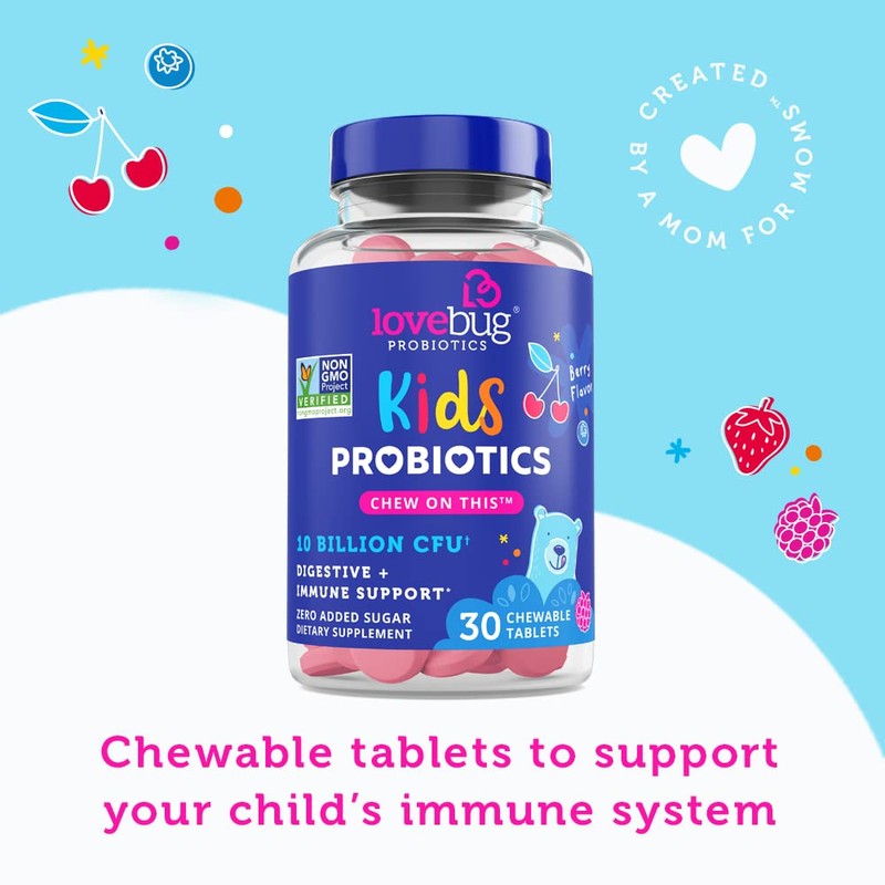 lovebug PROBIOTICS for Kids | Multi-Strain 10 Billion CFU | Constipation & Stomach Discomfort | Sugar Free | Ages 4+ | Natural Berry Flavor | 30 Chewables