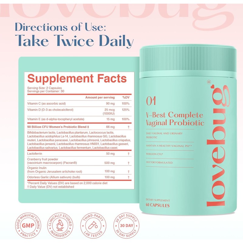Lovebug V-Best Vaginal Probiotics - 90 Billion CFU Womens Probiotic for PH Balance, Urinary Tract Health, BV & Odor, Probiotics for Women with Lactobacillus Acidophilus, Rhamnosus GG, Reuteri - 60 Ct