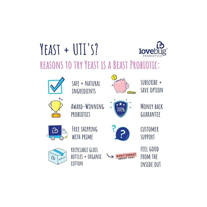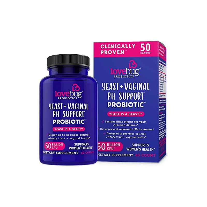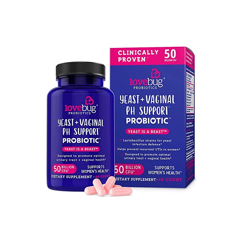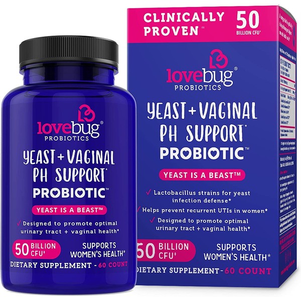 Lovebug Yeast + Vaginal pH Support | Clinically Studied Ingredients for Yeast & UTIs | Multi Strain 50 Billion CFU | 60 Capsules