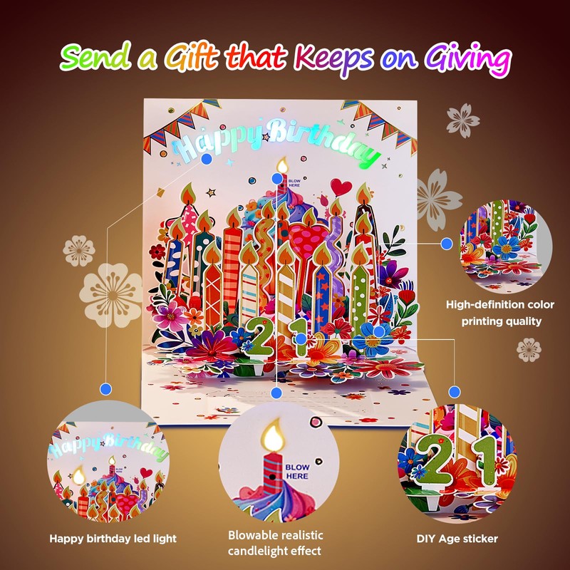 - POP-UP DESIGN: Stunning 3D birthday card featuring beautiful layered candles, cakes, and LED “Happy Birthday” reating a magical and unforgettable experience