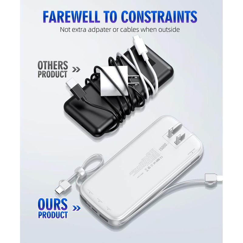 - Wide Compatibility: Portable charger is designed with 4 outputs: Type-C cable, iPhone cable, USB-A and Type-C output ports. USB-A port works with most electronic devices, Type-C Port compatible with iPhone 15 but type-c cable cannot.