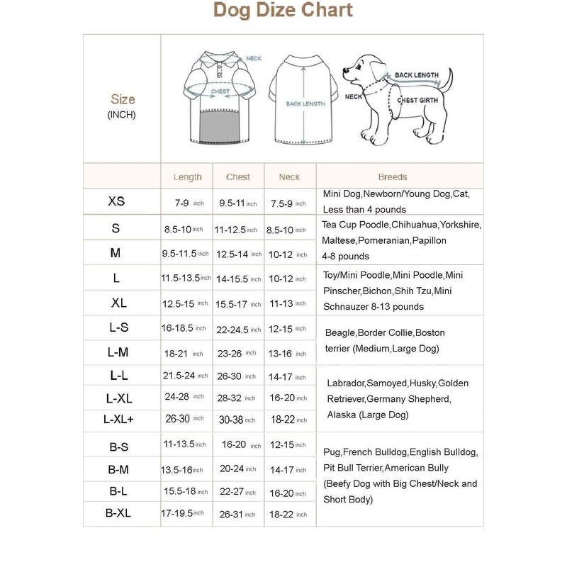 - Size XS to XL are fits for small size dogs, size L-S L-M L-L L-XL is for Medium large size dogs, B-S B-M B-L B-XL is for Bulldog Size (beefy dog with large chest/neck and short body). (measure your pet's neck girth ,chest girth and back length to compare the size chart in pic) make sure the best fit size for your puppy