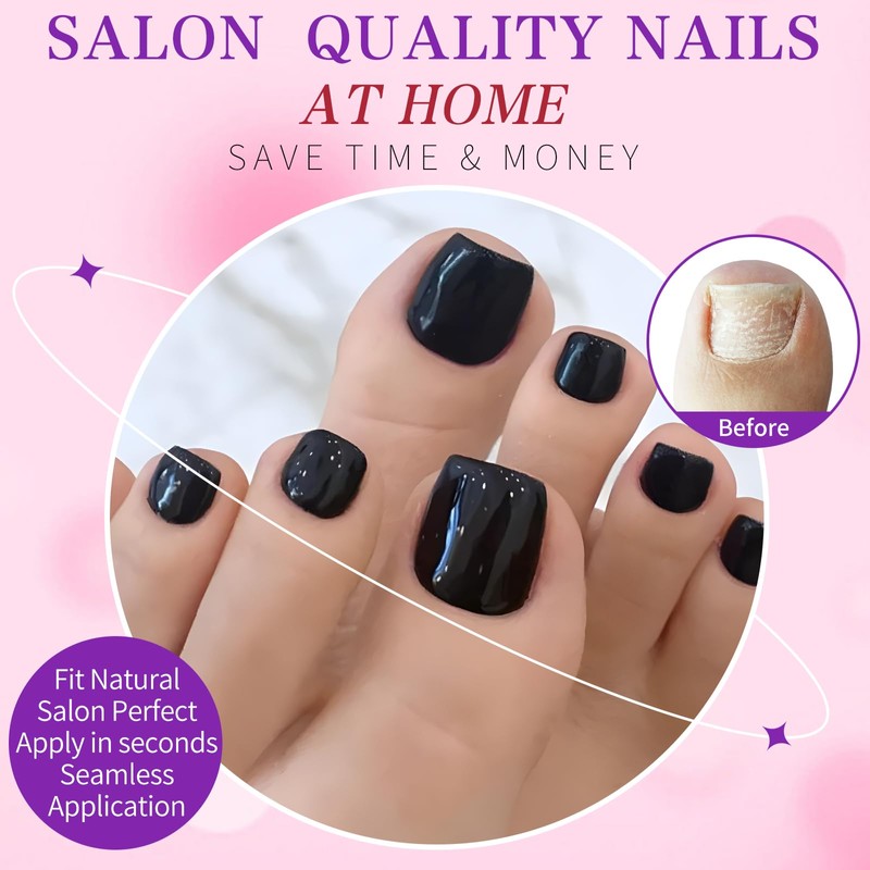 - đź’…Quanlity Toe Glue on Toenails: Black fake toenails press ons are made of quality ABS formulated to have a natural nail-like appearance. Pre-shaped toenails press on nails have a thin, flexible back edge for a seamless fit and comfortable wear, thick front tips for a strong and lasting wear.Black toenails fake feet provide full coverage square tips in a short square cut for a clean, filed-down effect. You can DIY salon perfect Black pedicure at home in few minutes with Black artificial toe nails.