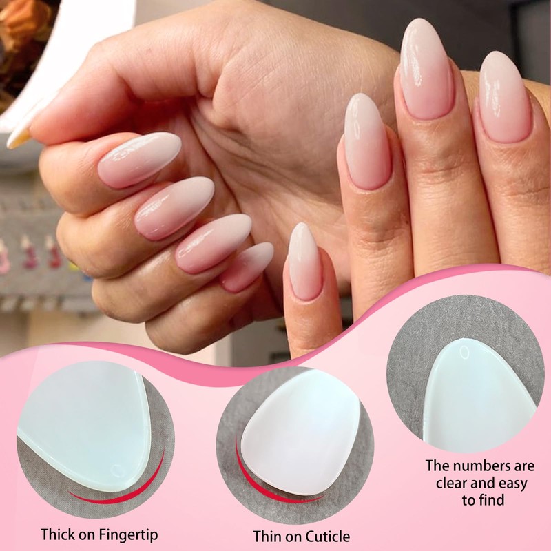 - Short Almond Shape Ombre Press on Nails Kit : Almond fake nail kit come with 144pc ombre design almond press on nails, 5 sheet adhesive nail tabs, 1 tube nail glue, 1pc nail file, 1pc nail wood stick. A simple press on nails set with basic nail stuff for a quick at home manicure or nail salon manicure design. Blush white ombre almond nails press ons nails with glue are perfect nail supplies to women and teen girls for casual and formal occasions.